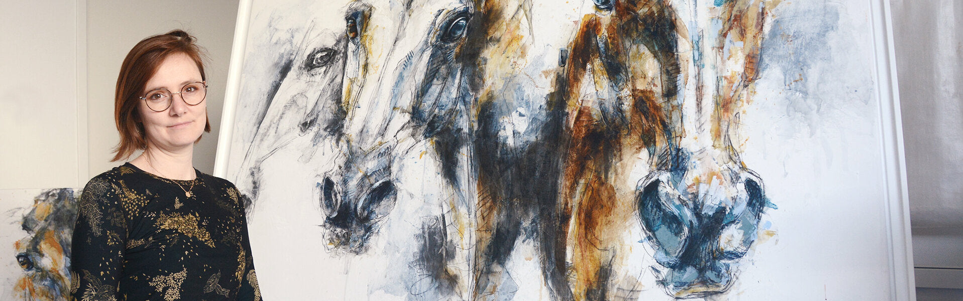 France based and internationally spreaded, Benedicte Gelé paint the horses, expressiveness and emotions. Born in 1975 in the Parisian suburb, however she’s never had connection with this animal until she started to ride them at the age of 15. In parallel, school was at best the place where she can draw horses on the sidelines of his notebooks, with her head more in the clouds than focused on the teachers' words. Obviously her parents agreed with an art cursus which ended the anxiety they felt at the end of each school years. Gelé was this kind of children who felt out of her place in this classic way of learning. She became graphic designer without stopping her research in the artistic way. Her curiosity and her desire to improve her skill, pushed her into learning by herself the different techniques like oil or watercolor. She started to paint landscapes with first success in regional exhibitions with some first prizes. In 2004, her job as art director ended brutally as she was pregnant. This unemployment time was undeniably a sign for her to start something else. Gelé became graphic designer and artist freelancer. On the horse side, she never failed to take time during the weekends with her mare she’s bought with the help of her parents and summer jobs when she was 18 yo. This first mare played a major role in her life without knowing it at the time. Benedicte Gelé learned a lot with her, humanely speaking as well as an equine level. She loved watch her evolved in her animal life, learned her expressions, attitudes and behaviors. Aware of the animal welfare, she looked for ways to always communicate and interact better with them. No wonder that she developed a keen sense of expressing their emotions. After landscapes, she has naturally came to paint horses with a little help of her husband who was at the base of this choice. Year after year, she became more artist than graphic designer letting a big part of her art express the natural emotional states of this animal and by extension, her own.