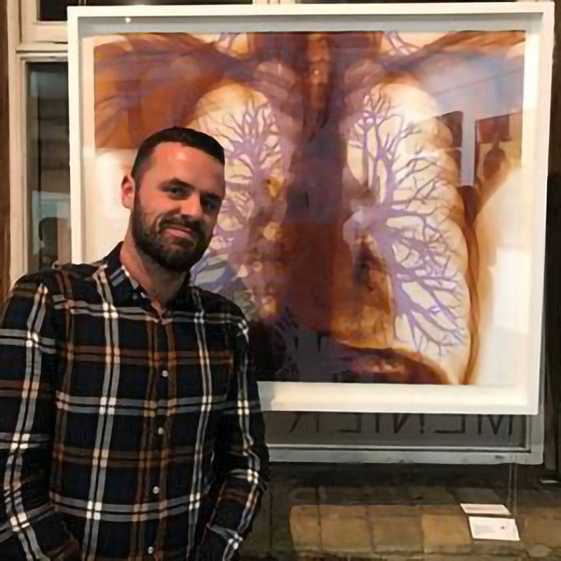 He often uses his own X-Rays which he transforms with bold colors and addition of Swarovski crystals, glitter and platinum and gold leaf. The message behind these colorful X-Ray works is always of inclusion and diversity. He is well known for depicting an X-Rayed Queen that has become one of his trademarks and