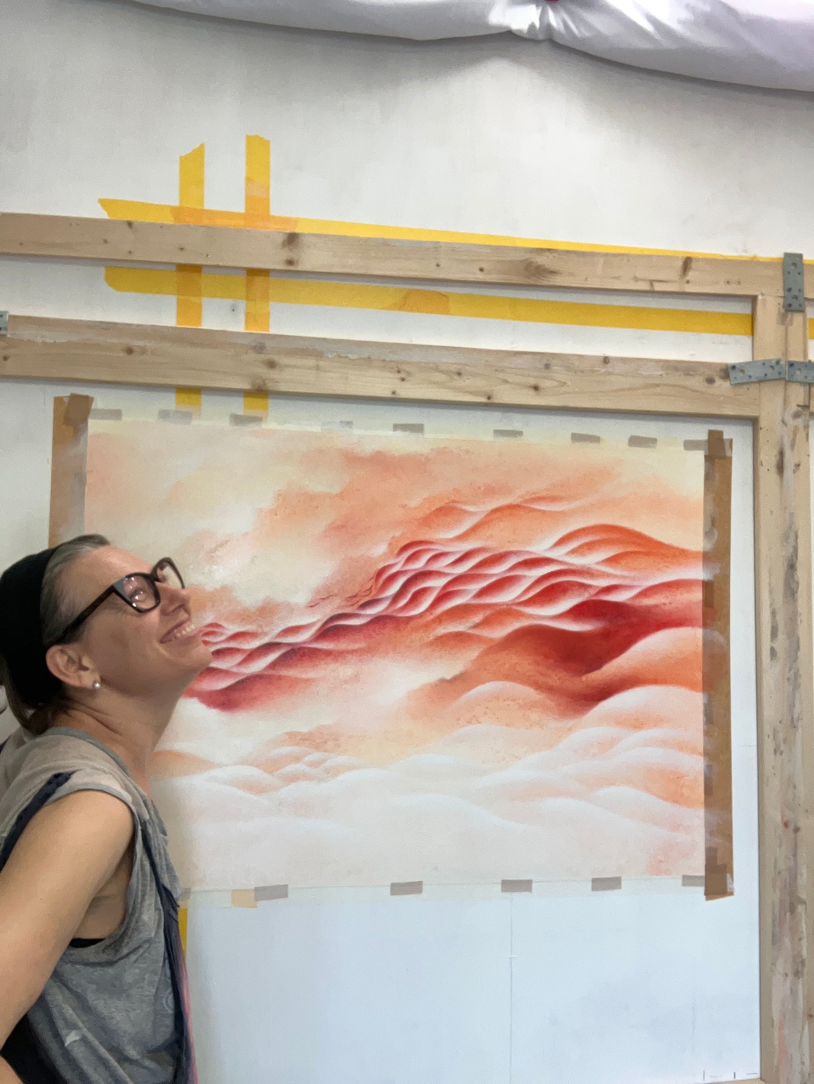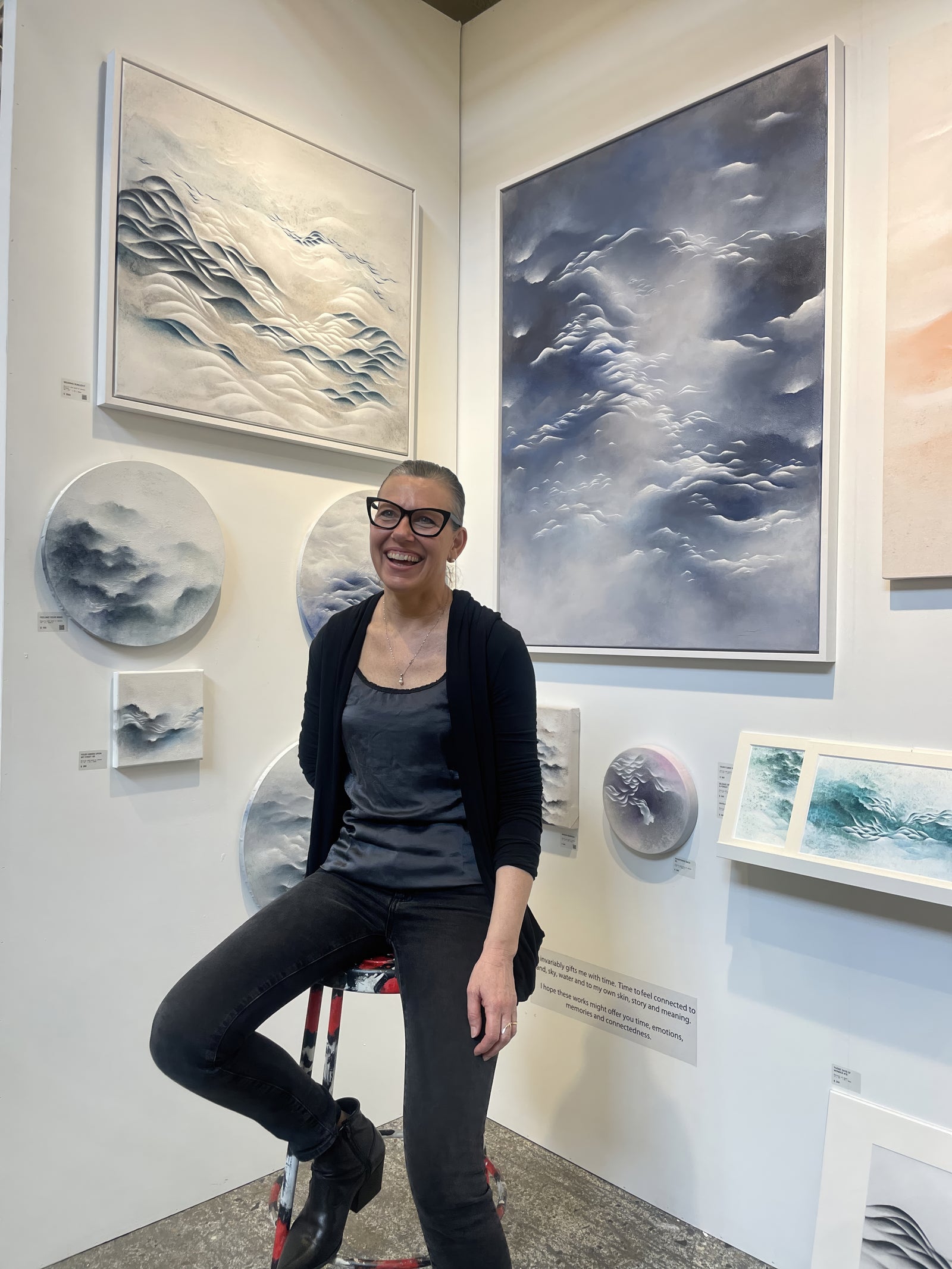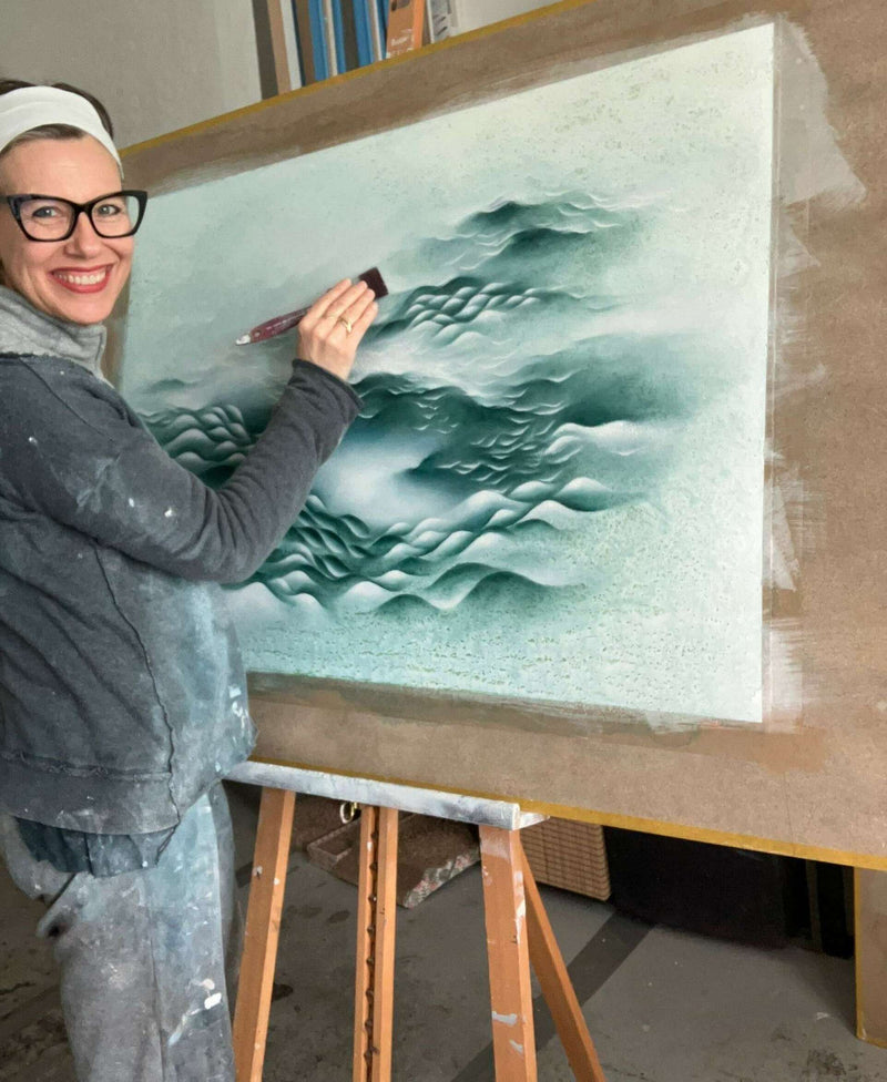 In the studio, I transform these impressions and emotions into streams of sandy textures, first shaped by water and my hands on the canvas, then smoothed by subtle chromatic transitions. My aesthetic approach emphasizes the fluidity of movement, blending soft, ethereal tones with more intense, vibrant passages that evoke the powerful forces at play in nature. These contrasts reflect the balance we all seek. The need to adapt like a bending tree in the wind, and the courage to face life’s challenges with the strength of a crashing wave. Blending a minimalist, restrained color palette with layered and interwoven undulating forms, each painting creates a sense of depth and complexity that draws the viewer's eye across the canvas, offering an emotionally resonant journey. Texture plays a significant role in my paintings, with rough, tactile surfaces juxtaposed against smoother regions, giving the piece an organic feel. The textured areas add a three-dimensional quality to the work, enhancing its visual impact and reinforcing its connection to natural elements. The swirling forms and dynamic contrasts evoke a sense of awe and connection to the natural world, reminiscent of natural phenomena such as wind, waves, geological formations, or animals moving as one. These elements symbolize nature's power and beauty that can be our own source of courage. Each painting traces a symbolic journey for us to become part of nature — fragile, brave, and beautiful. Again and again.
