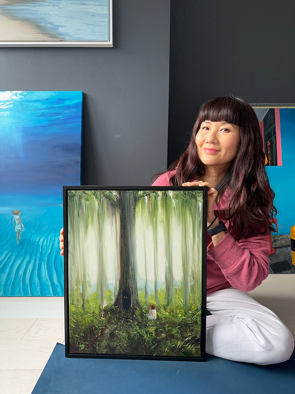 Her favorite medium is oil, using the classic style oil painting techniques to create contemporary pieces. She gets her inspirations from observing life, exploring a concept or a current topic. Her body of work ranges from traditional realistic portraits, contemporary landscapes to topical themes in graphic style.