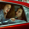 Carwash captures an intimate moment steeped in mystery and cinematic atmosphere. Two figures sit within the frame of a vibrant red car, their expressions layered with tension, tenderness, and unspoken narrative. The subtle reflection of clouds in the window adds a dreamlike quality, blurring the line between reality and imagination.