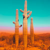 Chromatic Alchemy transforms the desert into a dreamlike vision of radiant light and bold color. Three towering cacti rise from sunlit earth, their forms illuminated against a sky that shifts seamlessly from turquoise to rose and orange. The metallic surface of the archival pigment print amplifies the saturation and depth, giving the scene a shimmering, almost otherworldly quality.