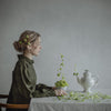 Green Tea by Dasha Pears is a limited edition photographic print on Hahnemühle Bamboo Fine Art Paper, available in 19.68 × 19.68 in (50 × 50 cm), 27.55 × 27.55 in (70 × 70 cm), 39.37 × 39.37 in (100 × 100 cm), and 47.24 × 47.24 in (120 × 120 cm). Created in 2018, this serene composition presents a woman seated at a table, her hair delicately adorned with green blossoms that echo the cascade of petals falling between a teacup and teapot. The muted palette and quiet atmosphere evoke balance, ritual, and the harmony of nature with human presence. Blending surreal simplicity with meditative symbolism, the piece invites contemplation and offers collectors a timeless work that combines visual elegance with narrative depth.
