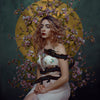 Sakura captures the delicate balance between fragility and strength through a striking composition that blends natural symbolism with surreal elegance. Surrounded by blooming cherry blossoms, the central figure radiates both vulnerability and resilience, her form entwined with dark, serpentine elements that contrast against the softness of spring. The golden halo behind her suggests a timeless sense of reverence, transforming the portrait into a meditation on cycles of life, rebirth, and inner power.