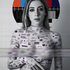 The figure is layered with logos, phrases, and symbols from popular culture, evoking the way society writes itself onto the body and identity. Behind her, the television test pattern becomes a halo of modern iconography, highlighting the tension between individuality and collective memory. The muted grayscale palette, disrupted by vivid blocks of red, blue, and orange, adds a striking contrast that pulls the viewer into the artwork’s dialogue on belonging and media influence.
