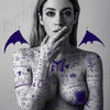 Sign There is a bold and thought-provoking artwork that transforms the body into a living canvas of symbols, words, and sketches. Blue ink-like markings cover the figure, blending innocence and rebellion with cultural and personal references. Playful doodles intertwine with provocative messages, while devil horns and bat wings suggest both mischief and self-awareness. The layering of symbols captures the complexity of identity and the way meaning is written onto the body, whether through choice, society, or memory.