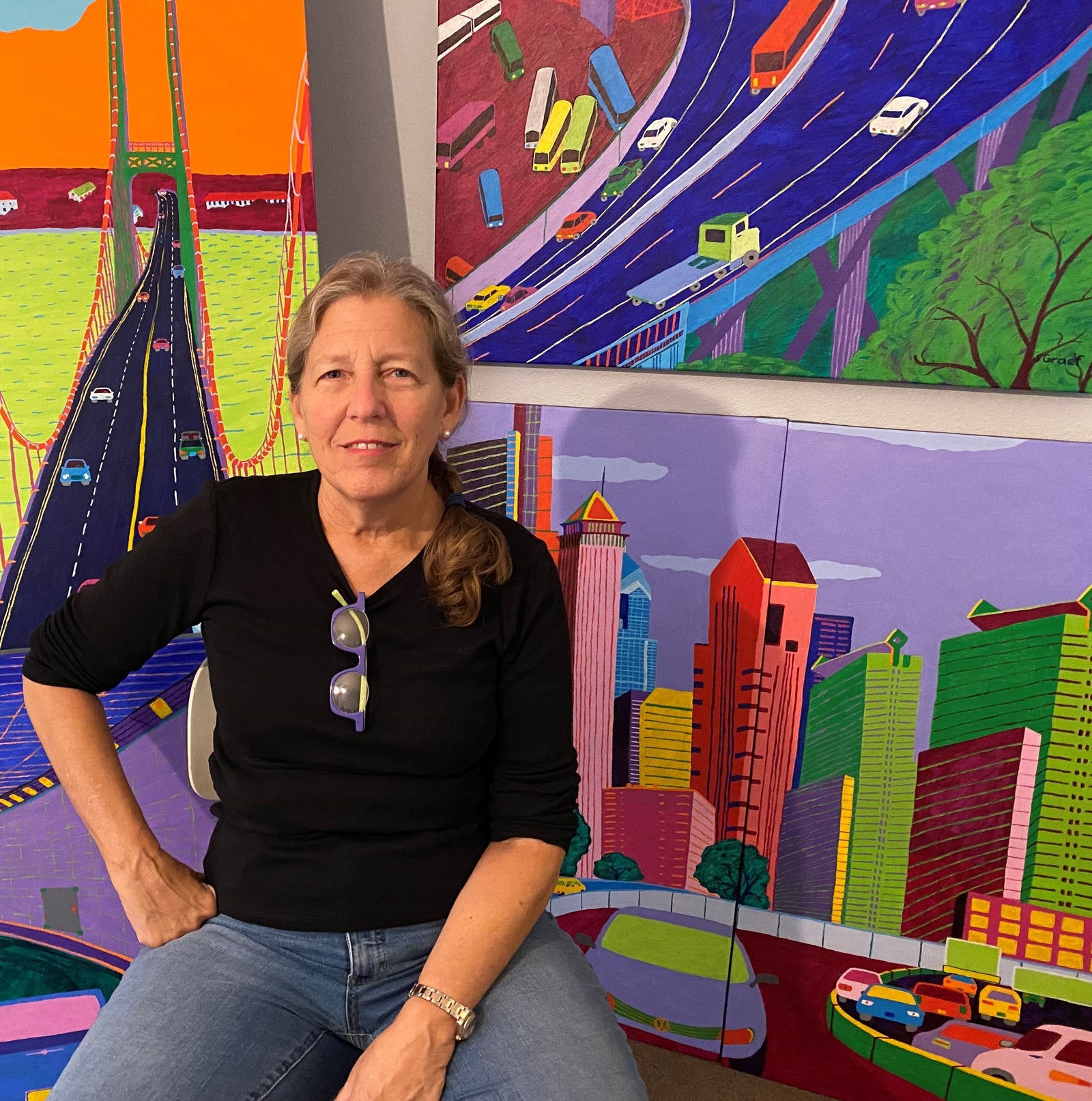 Sue Graef is an American artist whose vibrant and imaginative works breathe life into the everyday. Born in Philadelphia and now living in Florida, Sue’s art transforms familiar urban scenes into playful, dynamic compositions filled with energy and color. Whether it’s a bustling city skyline or an everyday object like a mailbox, her work invites us to see the world in a fresh and whimsical way.