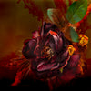 The Fire Dragon radiates raw power and passion through a dramatic fusion of crimson petals, glowing embers of gold, and deep shadows that suggest both mystery and vitality. The composition evokes fire itself, with blossoms unfurling like flames against a darkened backdrop, creating an atmosphere of strength, transformation, and eternal renewal.