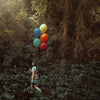 The Secret Party invites viewers into a world where innocence and mystery intertwine. Set against a lush, overgrown landscape, the figure stands poised with a cluster of colorful balloons that break the quiet green with a sudden burst of vibrancy. The contrast between the natural setting and the playful, almost childlike symbol of celebration creates a surreal tension, as though the viewer has stumbled upon a moment that exists outside of time.